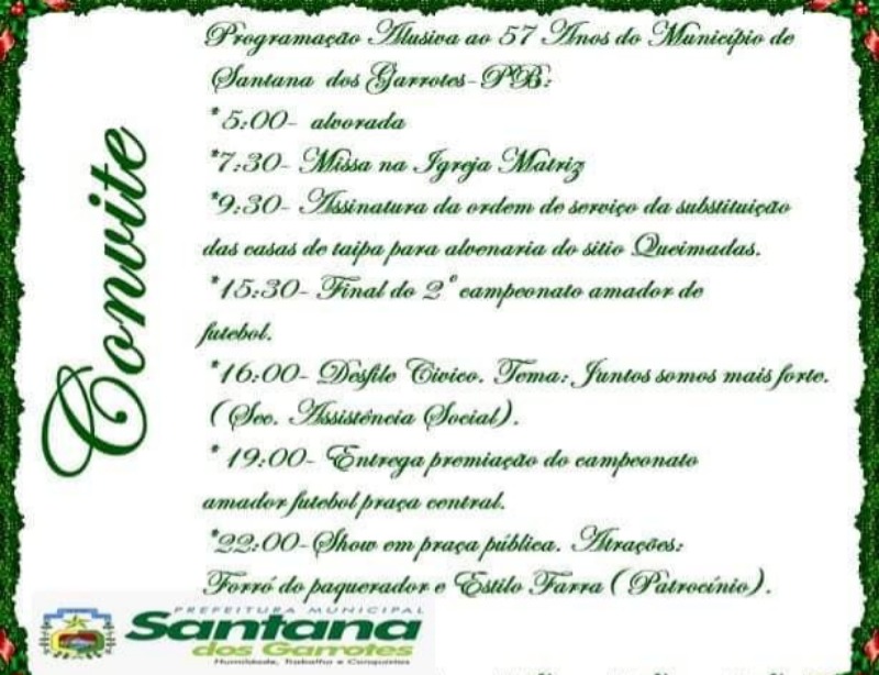 A Prefeitura Municipal de Santana dos Garrotes realizará no próximo sábado (22), a festa em comemoração aos 57 anos de emancipação política do município.